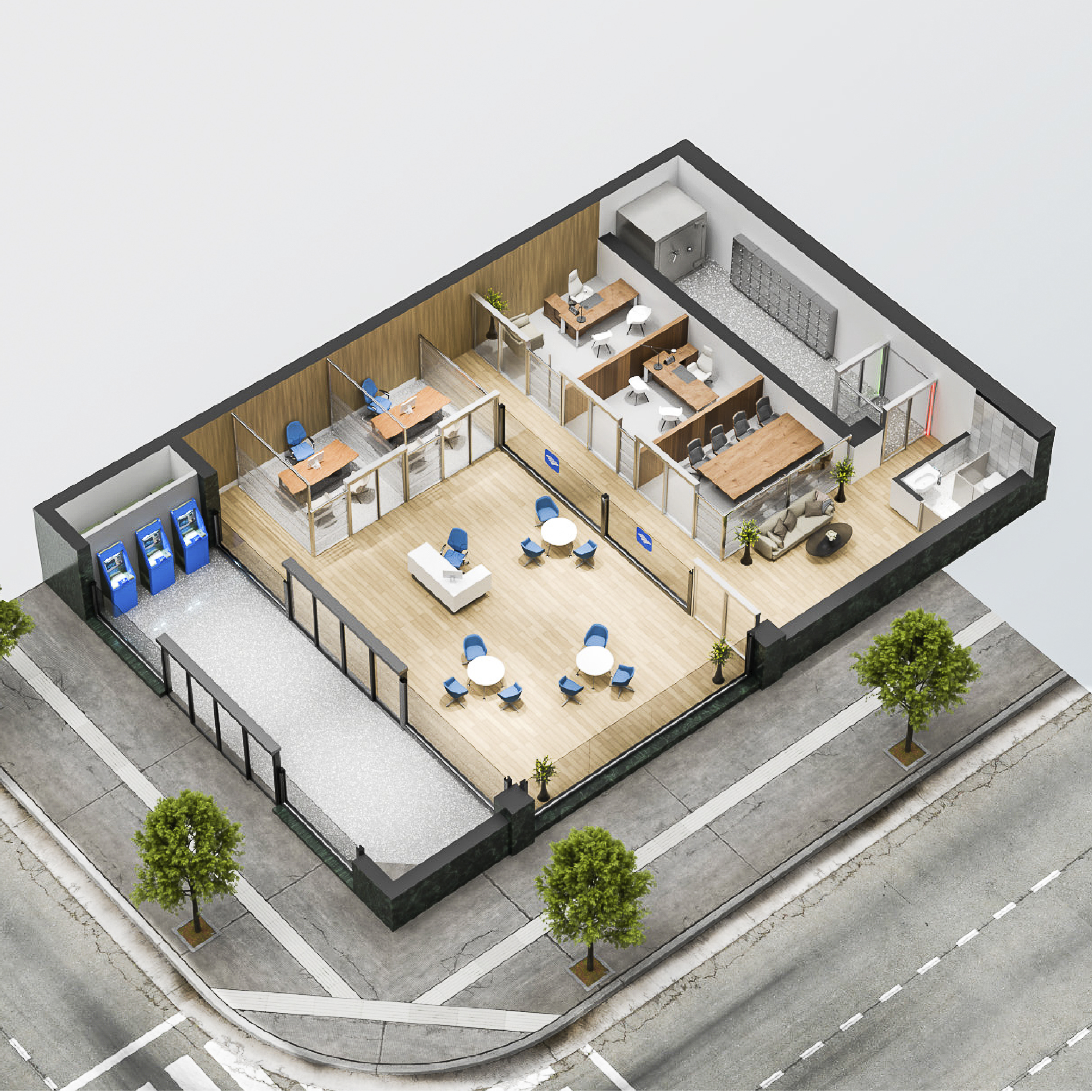 Flujo eficiente de clientes: Facilita el movimiento de clientes, reduciendo congestionamientos en las entradas y salidas, y mejorando la eficiencia operativa del banco.